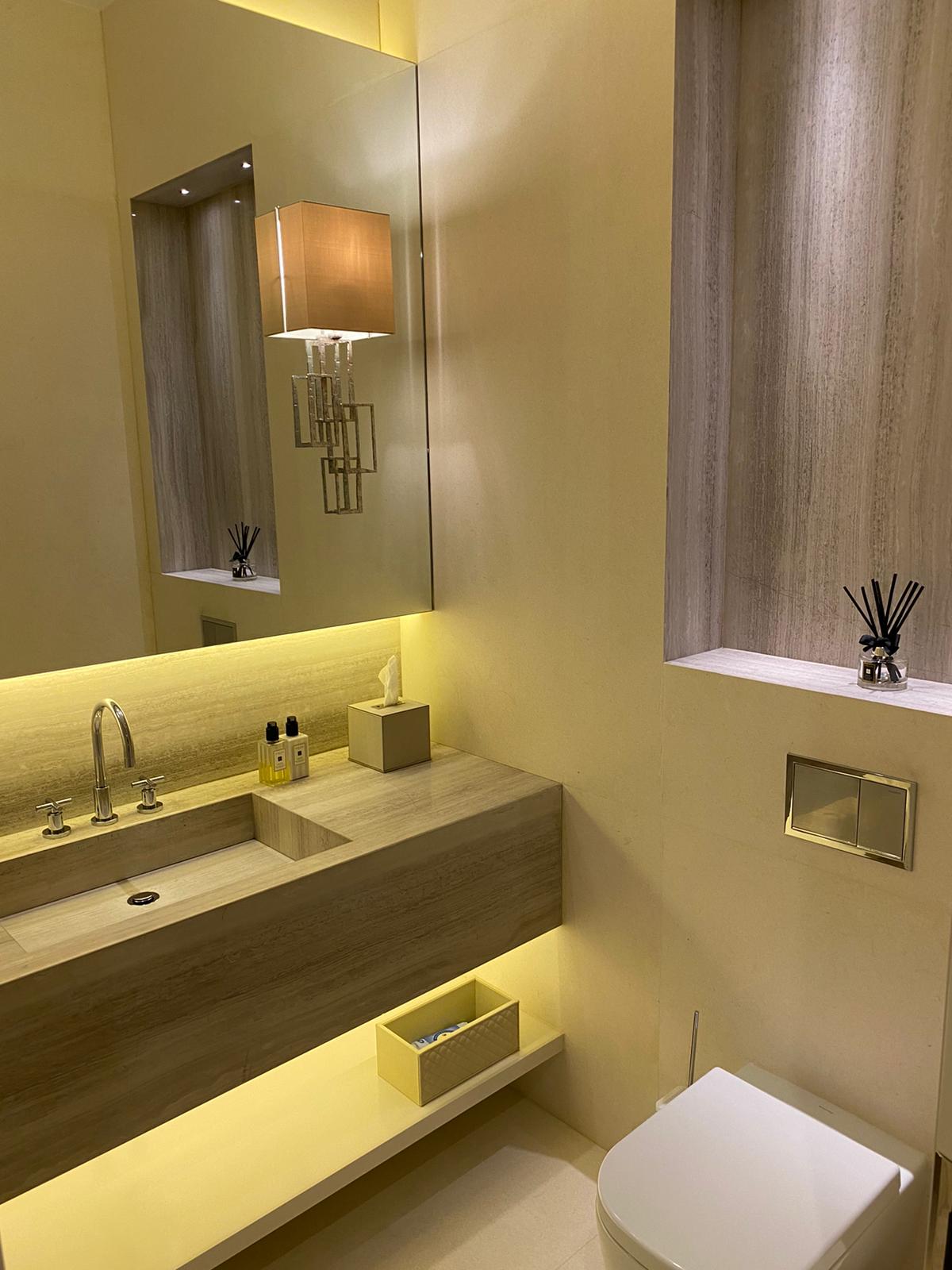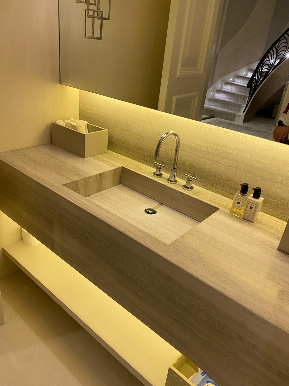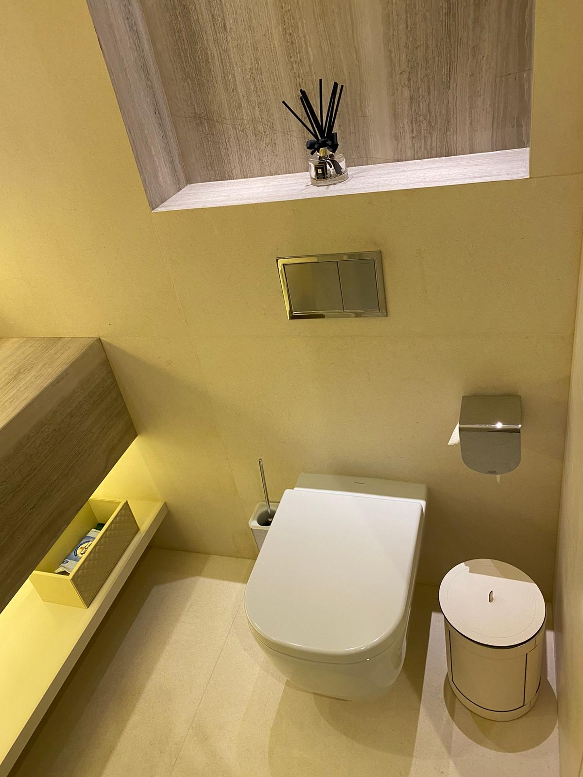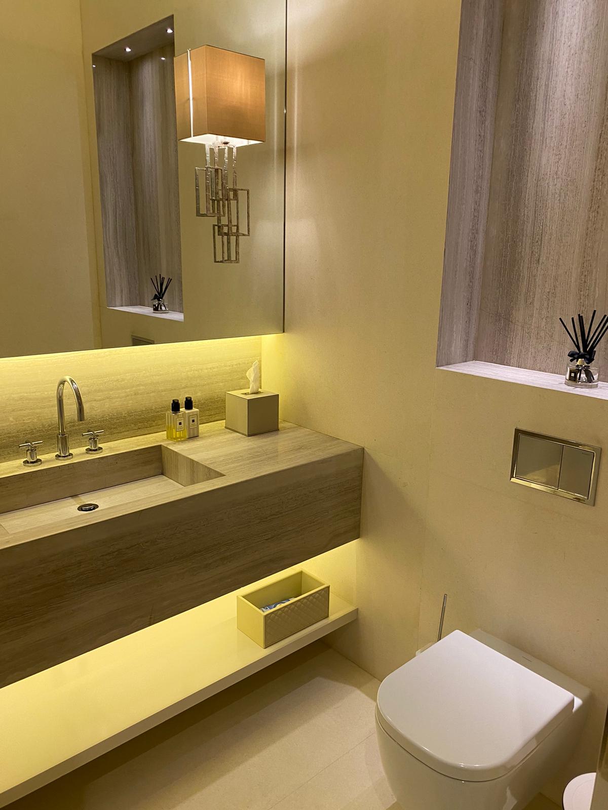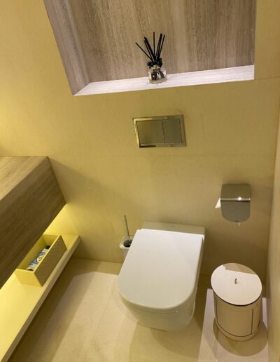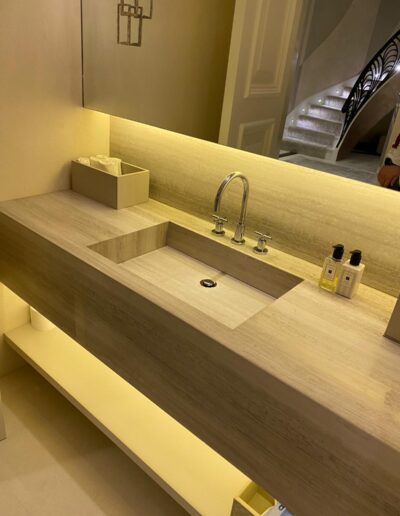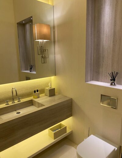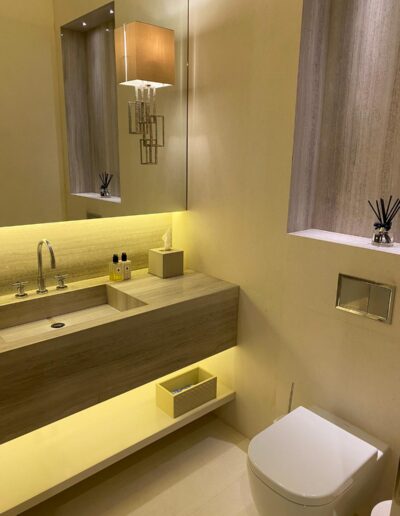 This powder room combines cream marble tiles with natural wood vein marble. The whole vanity countertop is formed of the same wood vein marble for a sleek and clean design. The vanity countertop has been cut in the middle to form the sink. The basin is the same marble but has been glued (with special marble glue) from underneath to the countertop. Underneath the sink we have one shelf for storage. The same wood vein marble has been used for the indented shelf above the toilet cistern which is mounted inside the wall. The yellow LED lighting around the mirror and underneath the sink creates a colourful and cosy effect. The wide mirror features 2 interestingly designed brass frame lights.