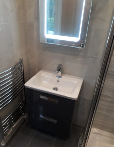 The different tiling within the shower, as compared to the whole room, and the mosaic feature above the toilet, gives this shower room an interesting and unique look. The curved sliding shower door is very functional within a limited room of space. There is no such thing as a small shower room, all you need is a clever design.